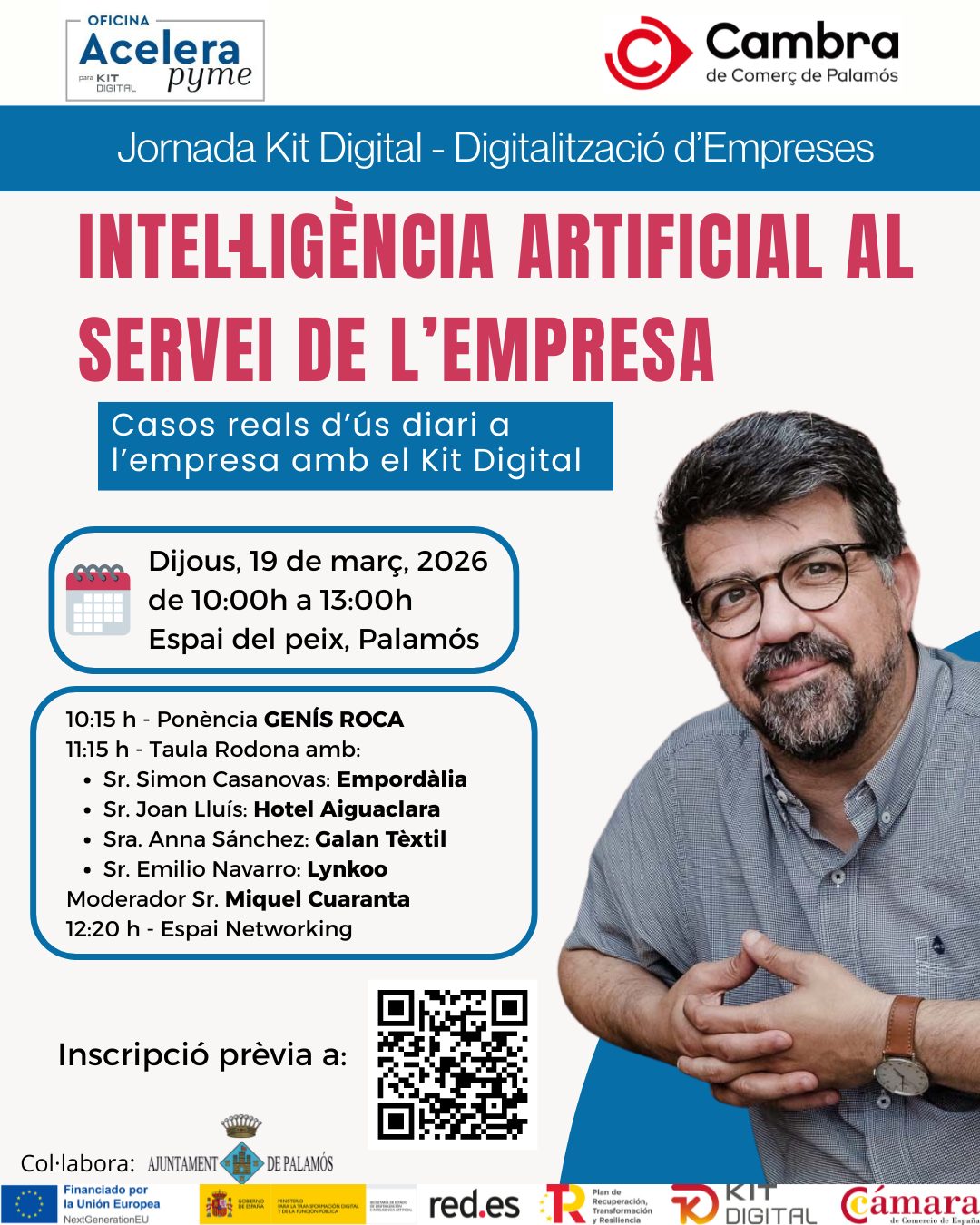 La sessió inclourà també una taula rodona moderada per Miquel Cuaranta, amb la participació d’empreses del territori que ja incorporen la intel·ligència artificial en el seu funcionament diari, com Empordàlia, representada pel director i gerent Simon Casanovas; Hotel Aiguaclara, amb el copropietari i gestor Joan Lluís; i Galan Tèxtil, de la mà de l’Anna Sánchez sòcia i gerent. Així mateix, hi intervindrà Emilio Navarro, especialista en solucions d’intel·ligència artificial de l’agent digitalitzador Kit Digital Lynkoo, que aportarà la visió tecnològica i les possibilitats d’implementació per a les empreses.